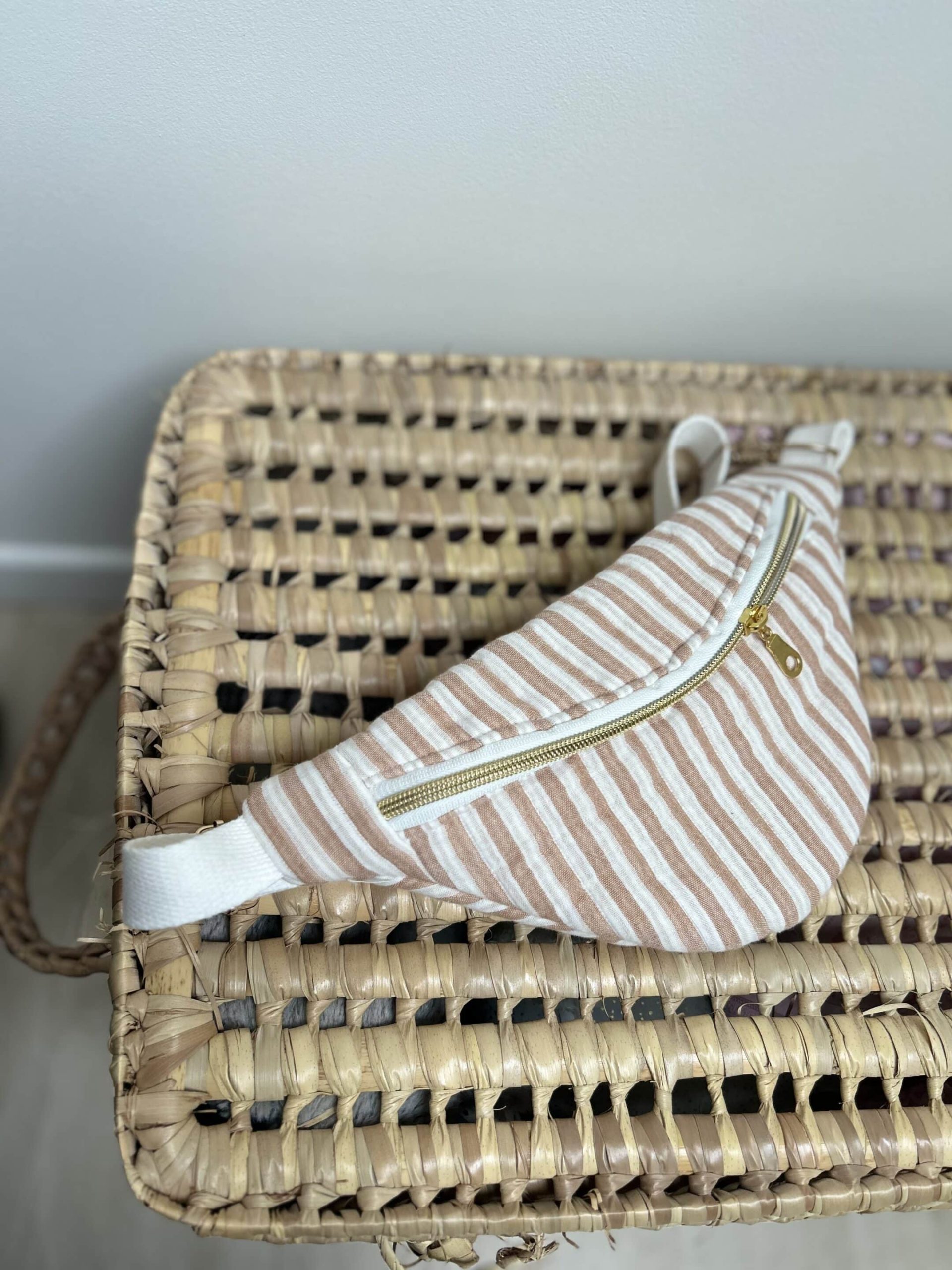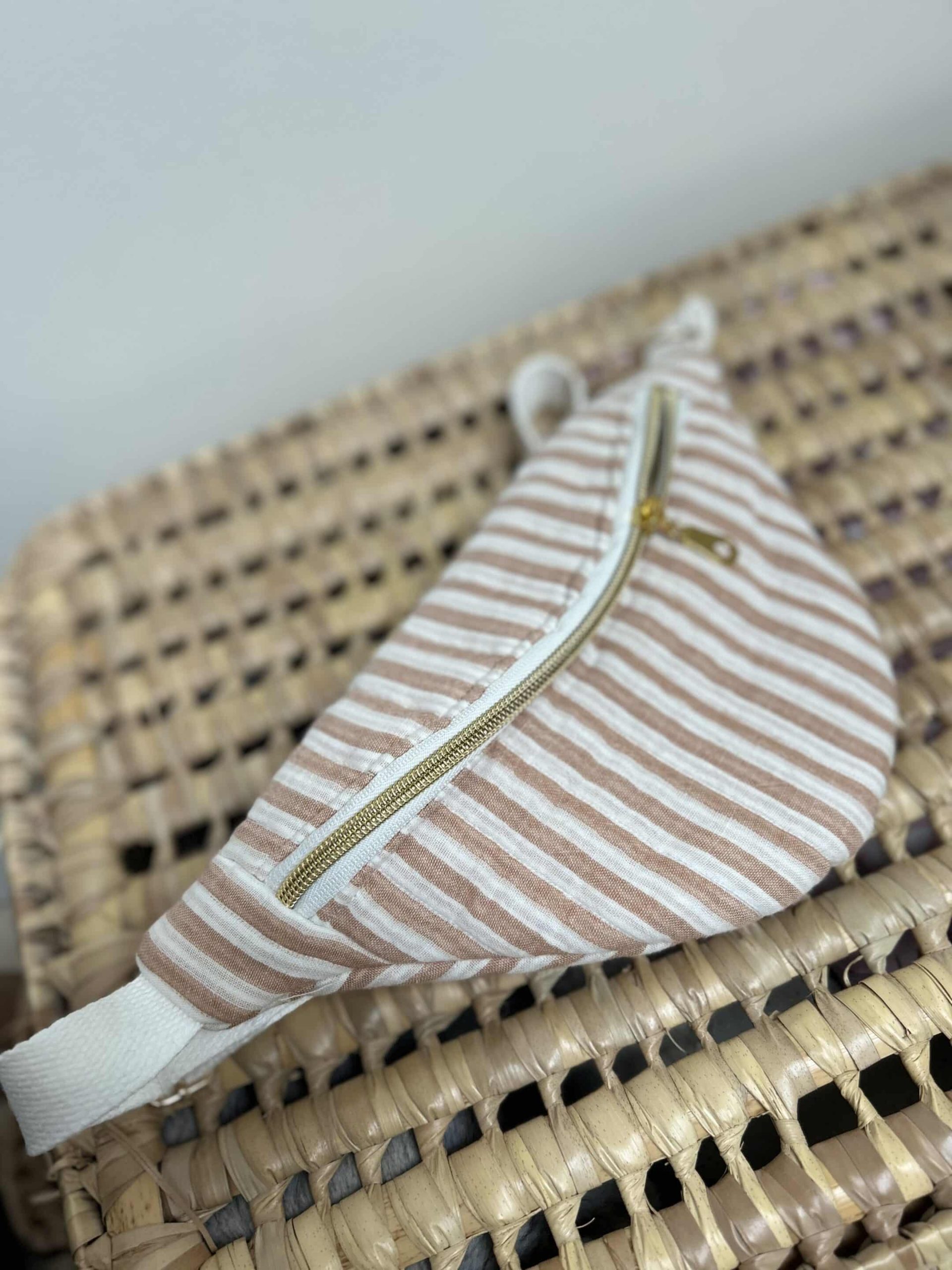 Sac banane en tissu double gaze molletonnée et tissu coton uni crème à l’intérieur.