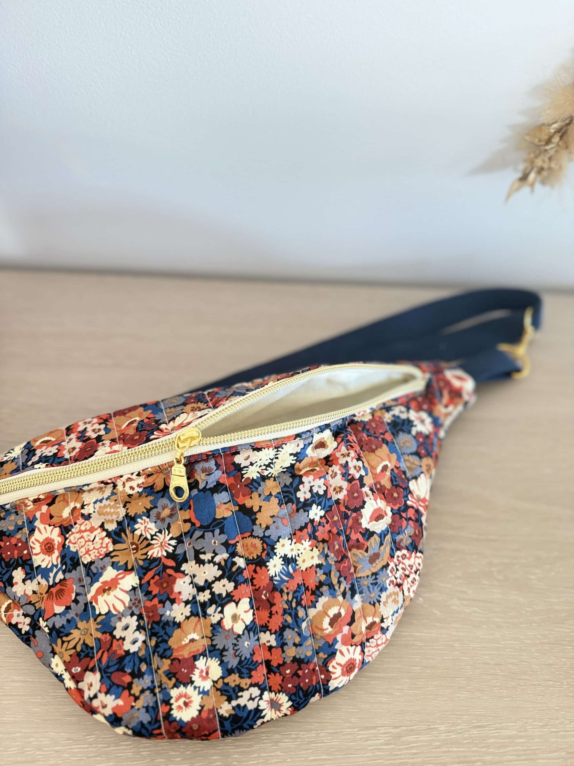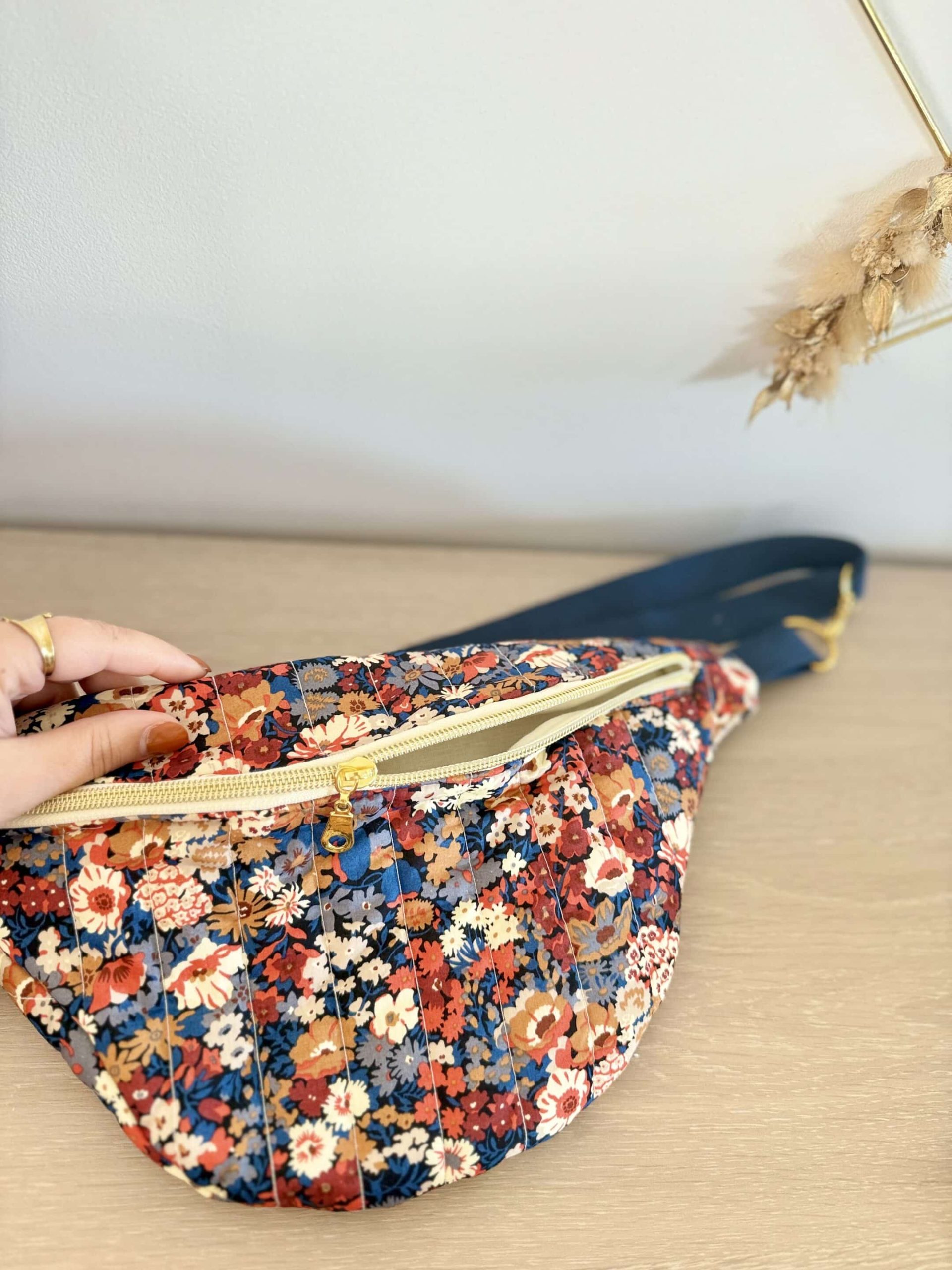 Sac banane en tissu liberty et uni crème à l’intérieur.