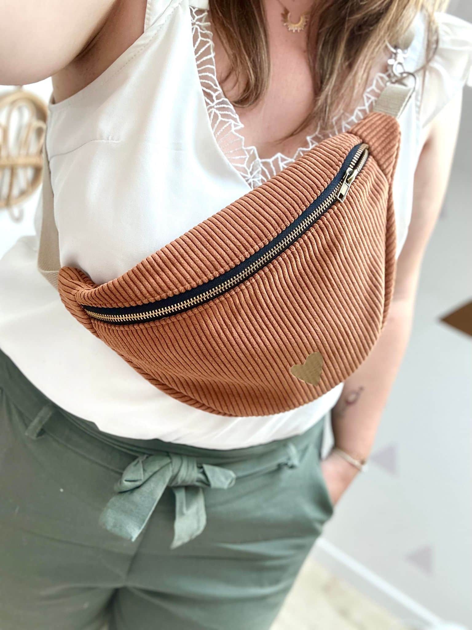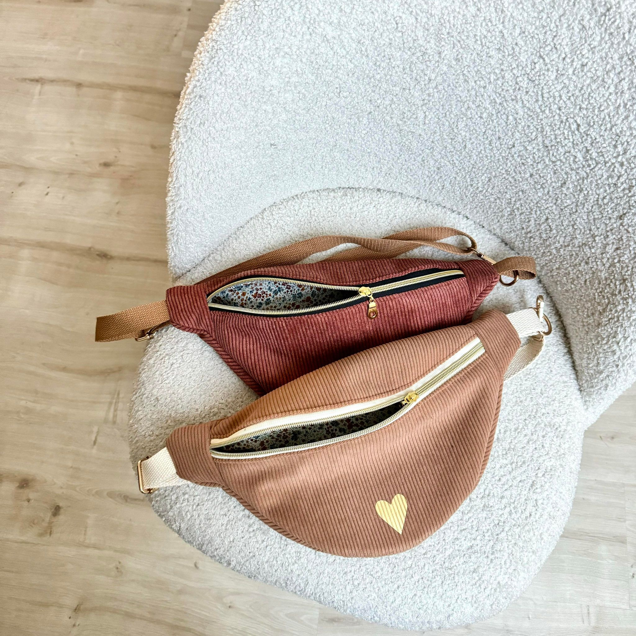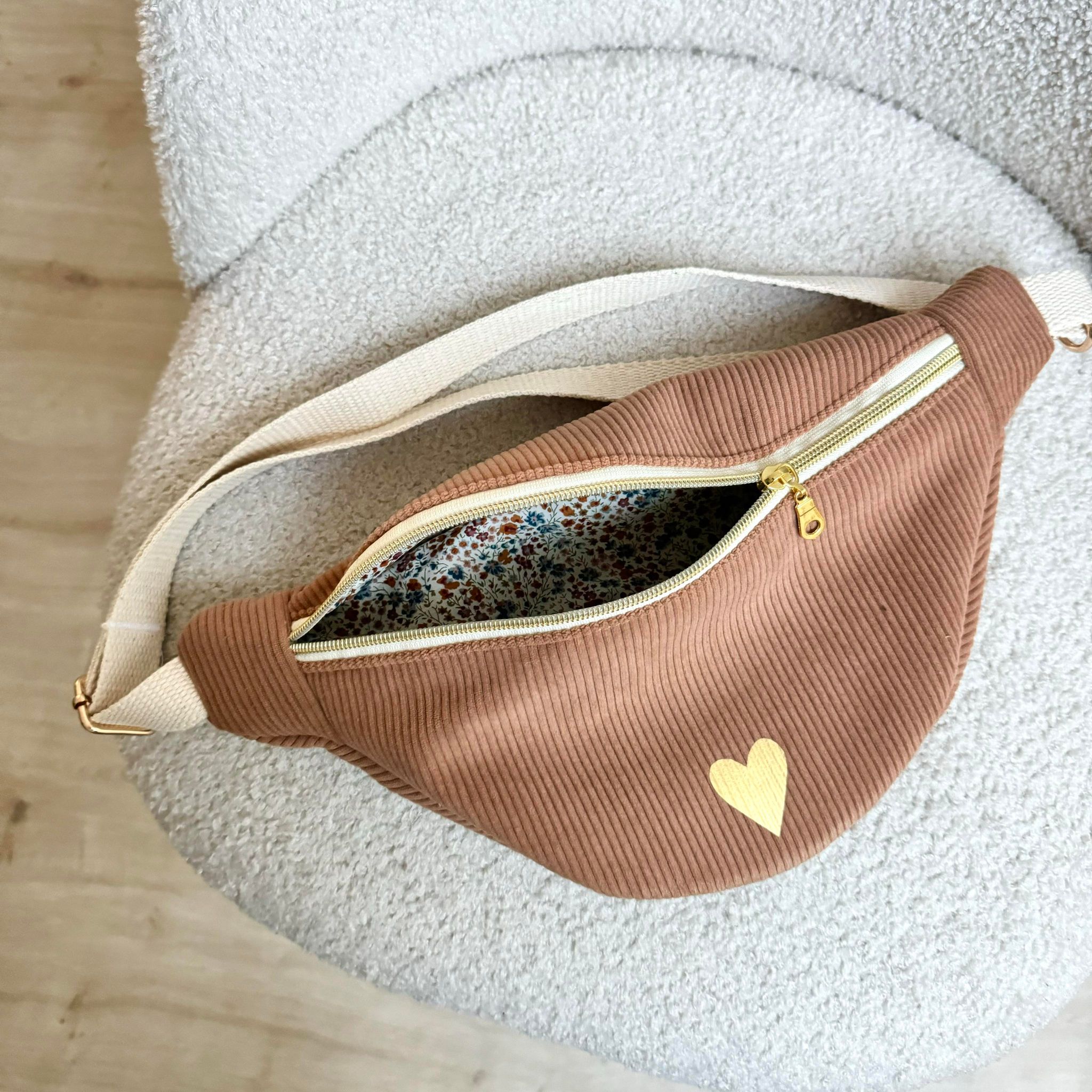 Sac banane en tissu velours côtelé couleur écureuil et tissu liberty poppy forest à l’intérieur.