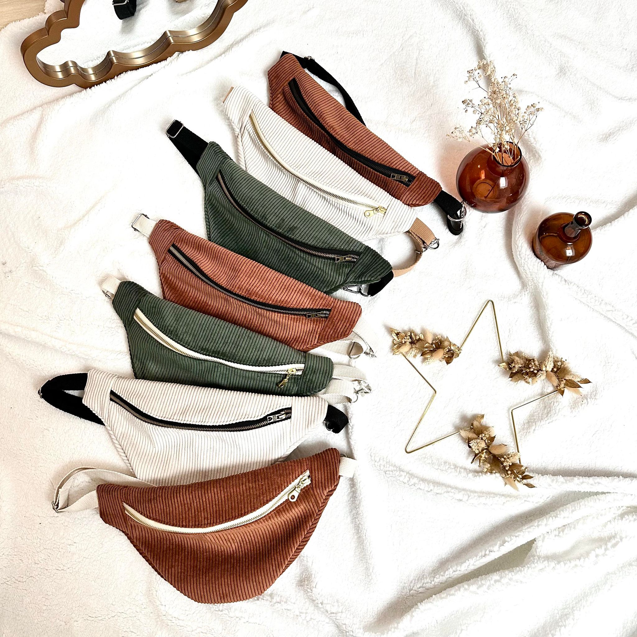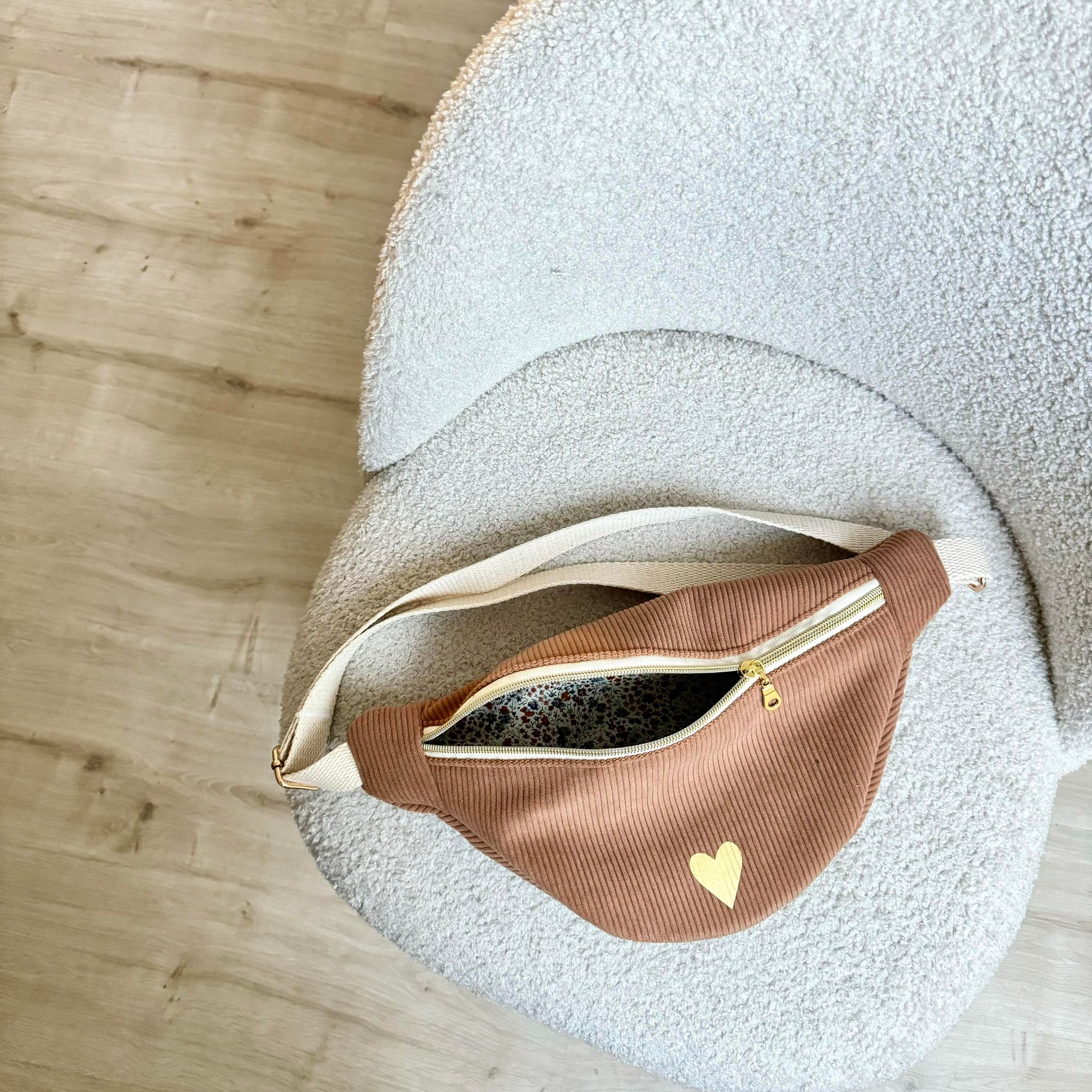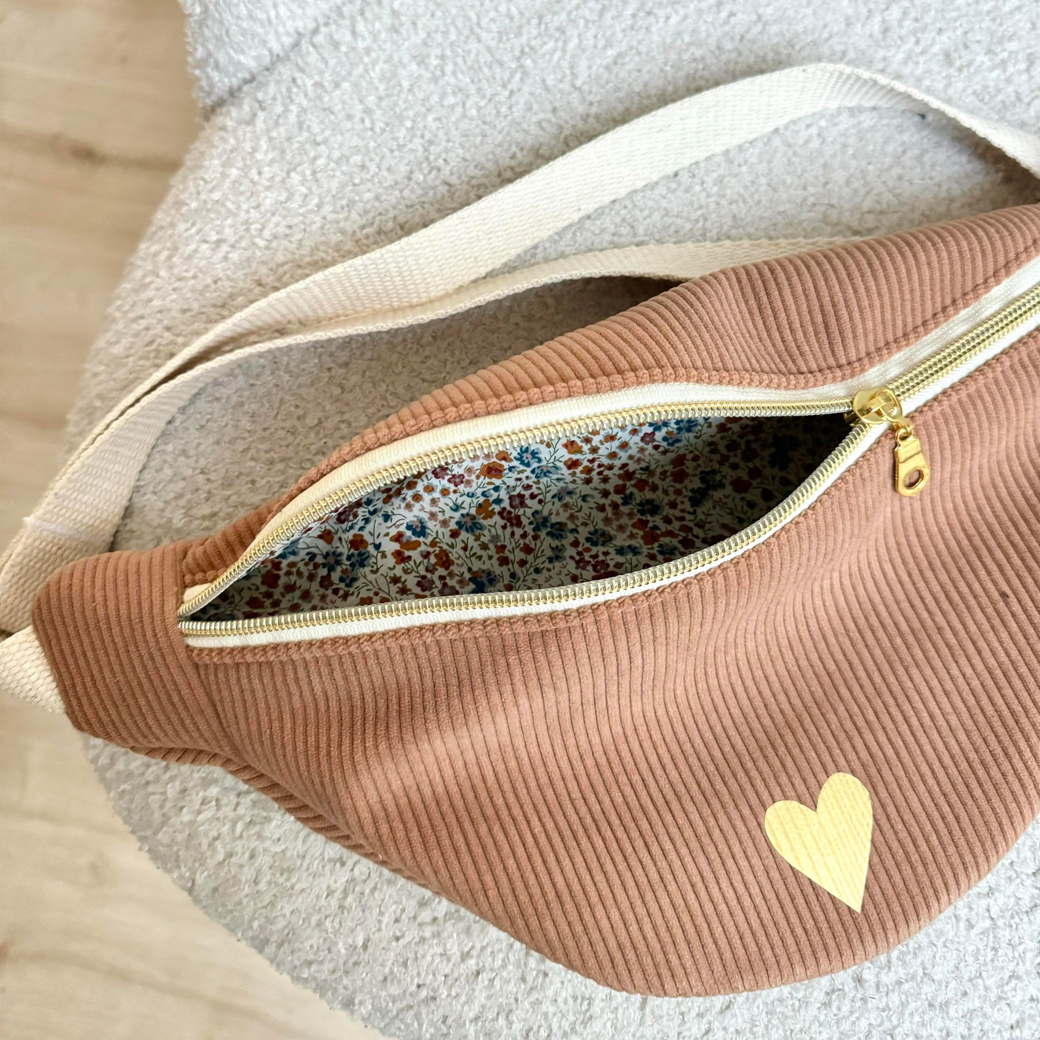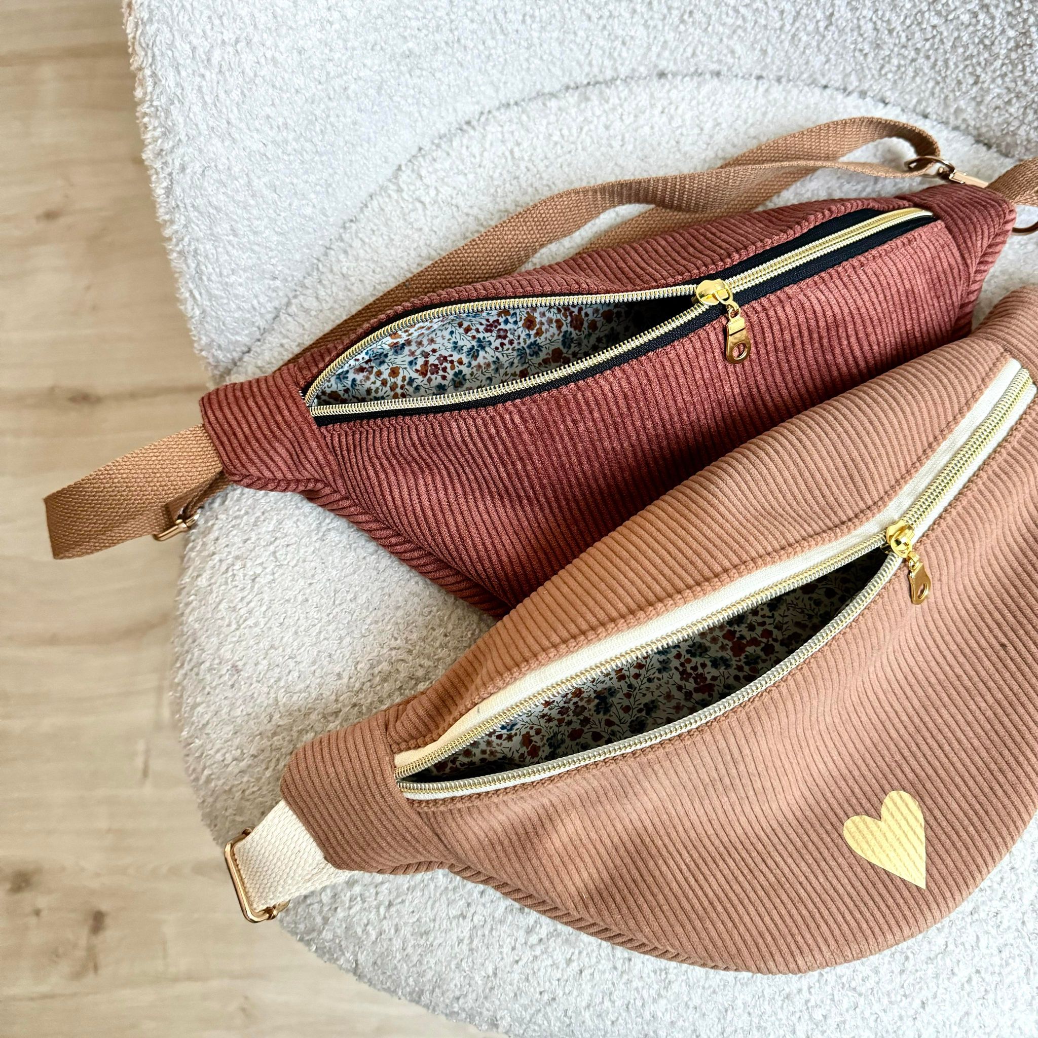 Sac banane en tissu velours côtelé couleur écureuil et tissu liberty poppy forest à l’intérieur.