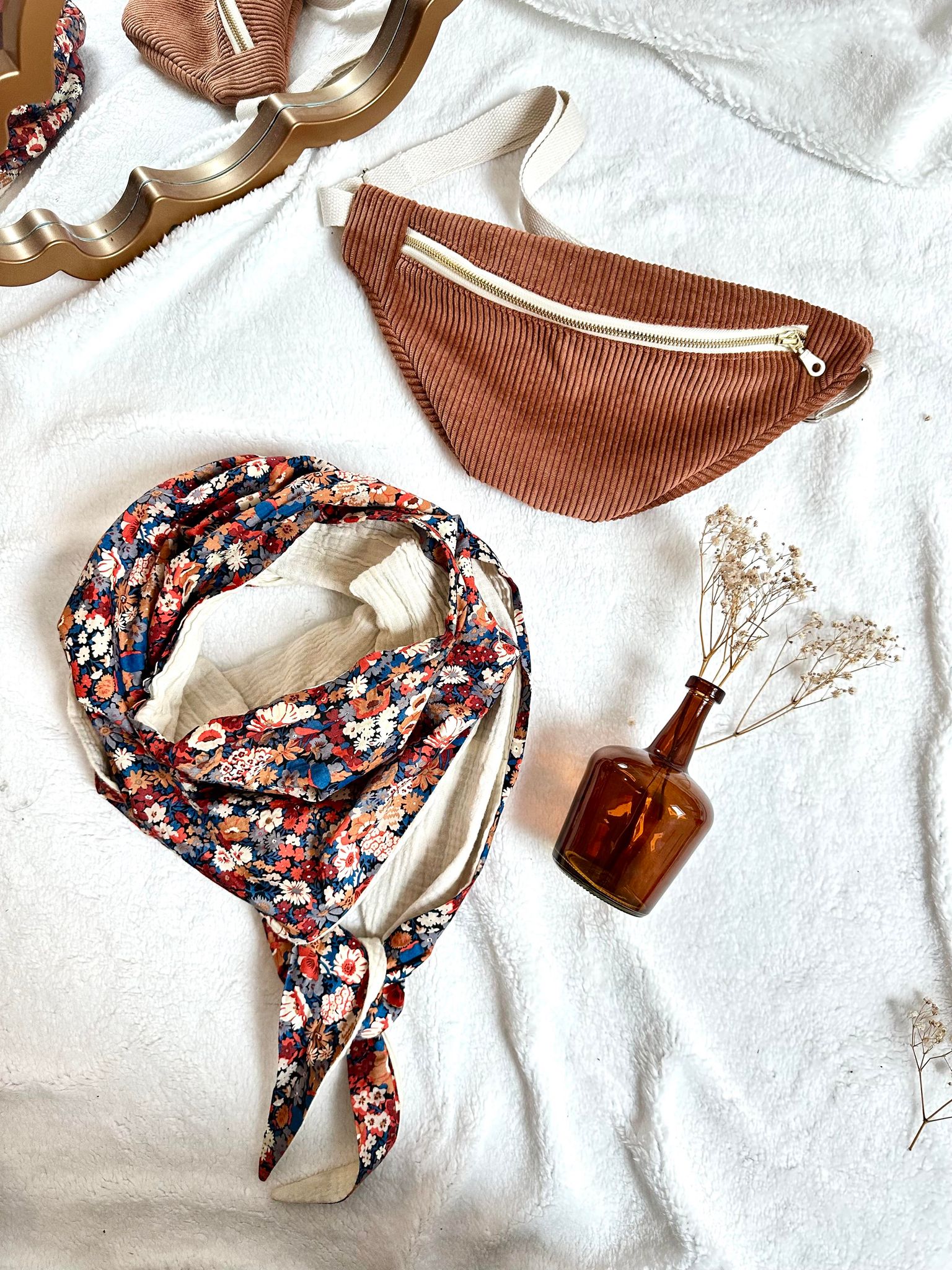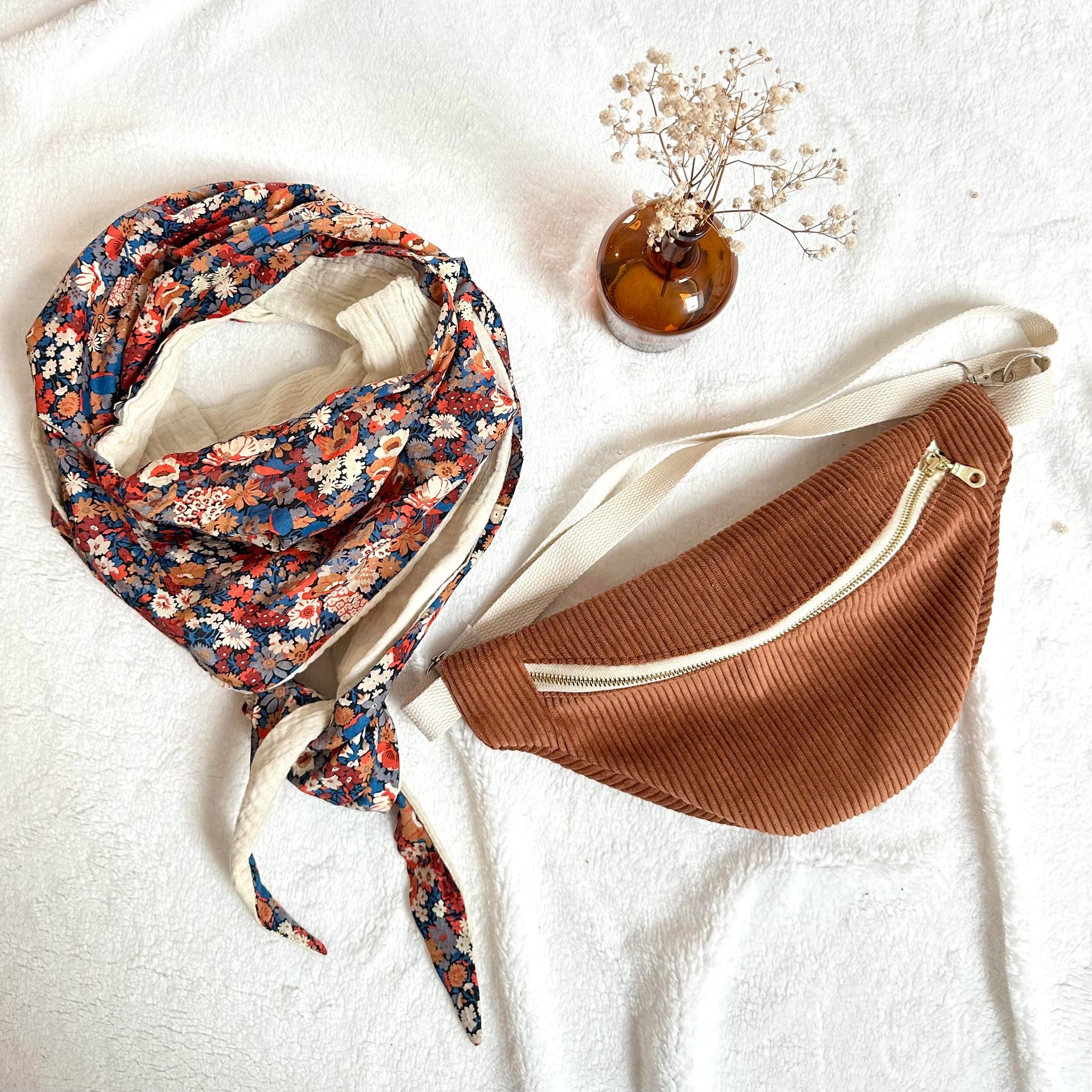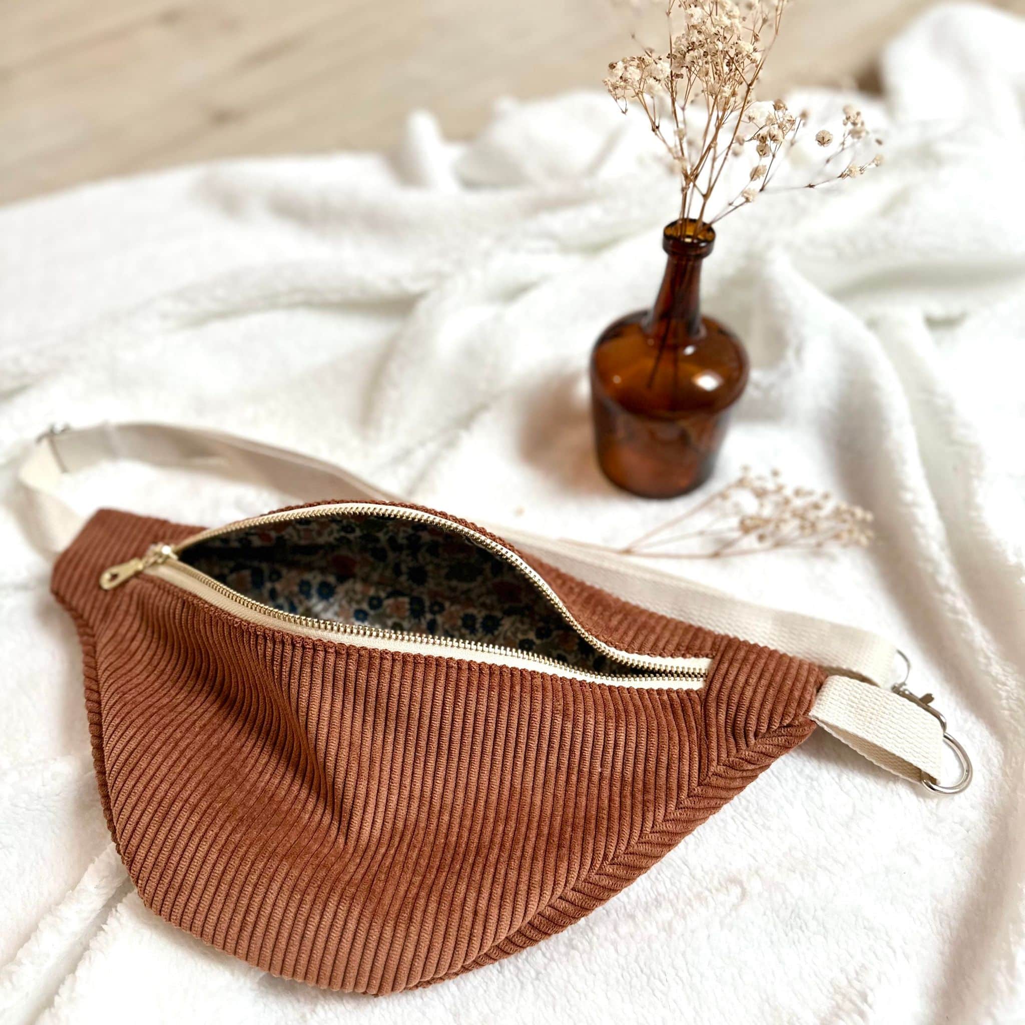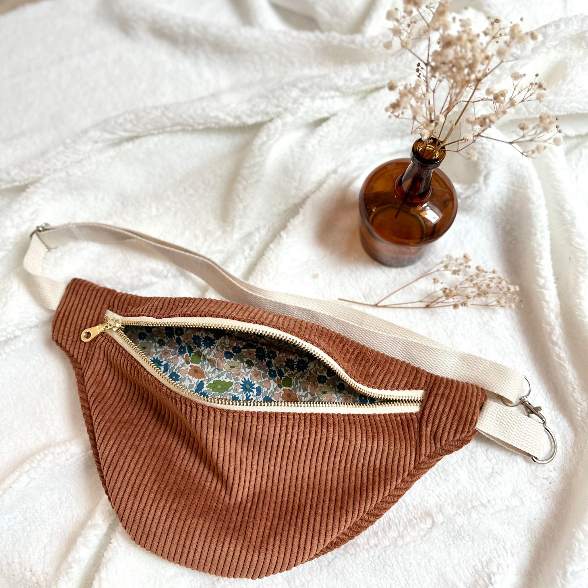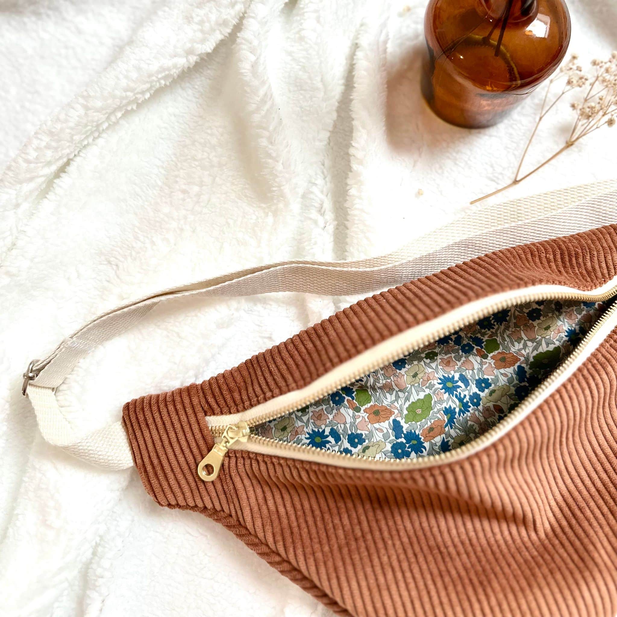 Sac banane en tissu velours côtelé couleur écureuil et tissu liberty poppy forest à l’intérieur.