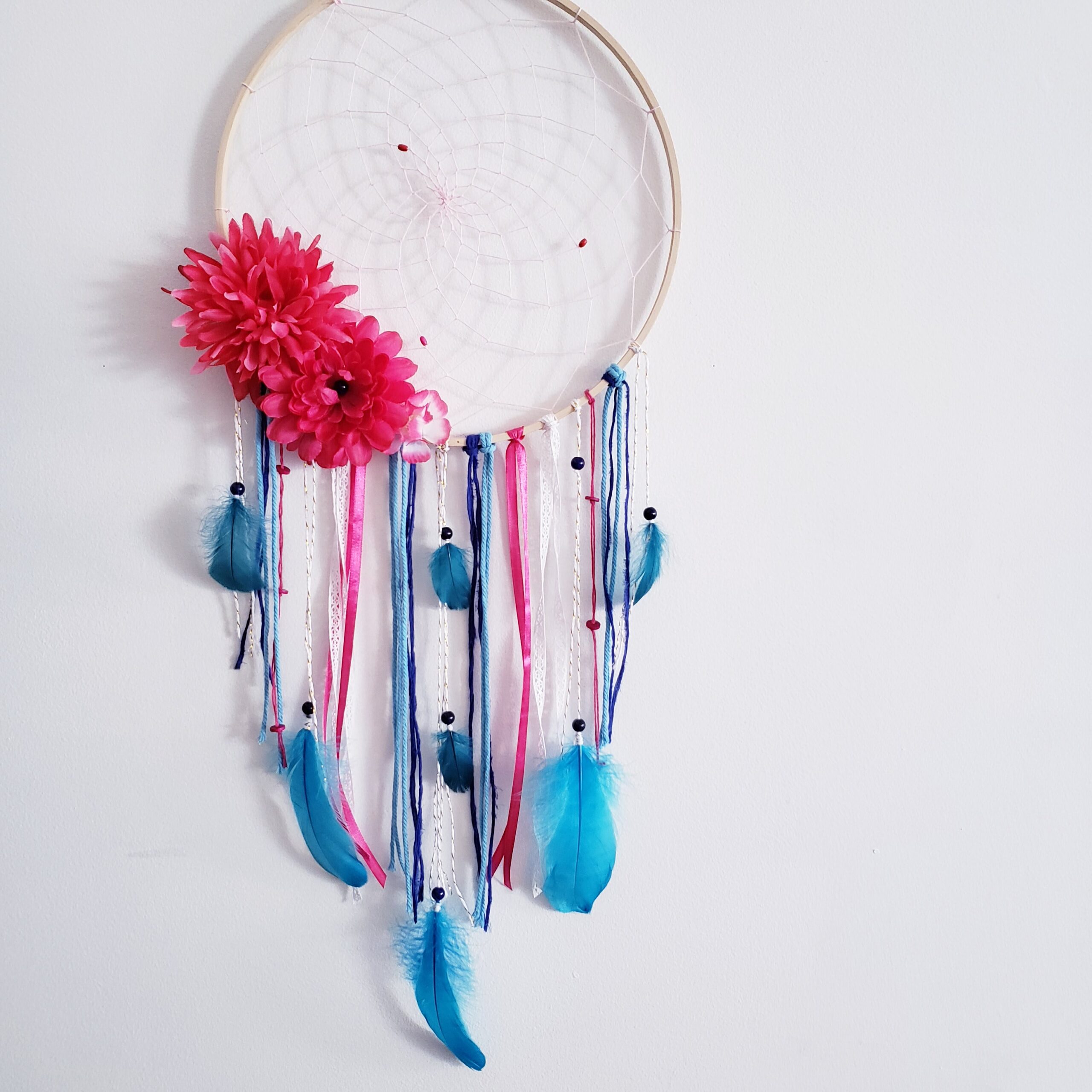 Collection de capteurs de rêves garni de fleurs. Ces capteurs sont créées sur mesure selon vos goûts, couleurs ou thématique.