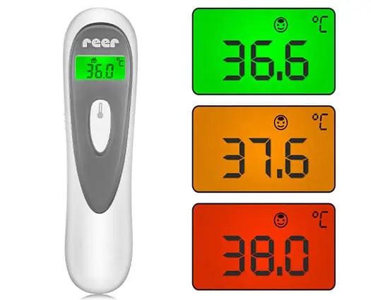 Thermomètre infrarouge à distance 3 en 1. Avec 3 modes de mesure de la température, corporelle par le front sans contact sur le front puis température des objets et température ambiante. Thermomètre sans contact qui mesure la température du corps, la température de surface et la température ambiante. Avec Un grand écran LCD éclairé avec Alarme fièvre visuelle à trois niveaux: vert < 37.5°c, orange 37.5-37.9°c, rouge > 37.9°c. Avec également une alarme de fièvre acoustique pour les températures supérieur à 37°c. Fourni avec piles et donc fonctionnel dés l’achat. Le fabriquant REER est le spécialiste des articles pour le confort et la sécurité de bébé et maman. Sûr, hygiénique il permet la mesure sans inconfort physique de la température. Le thermomètre sans contact de REER garde les 25 dernières valeurs mesurées et peuvent ainsi être surveillés en permanence. Parfait pour mesurer la température du bain, du lait ou des repas! Ce thermomètre sans contact est adapté à tous les âges. Trouvez dans la même catégorie le thermomètre 3en1 ou le babyphone de Motorolla ou le thermomètre de bain oval framboise!