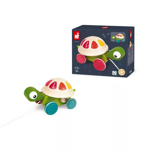 Jouet d’éveil à promener en forme de tortue de la gamme Zigolos. Lorsque que votre enfant promène sa tortue, les roues font tourner sa carapace aux jolies couleurs de l’arc en ciel. Roues silencieuses grâce au caoutchouc antidérapant. Ficelle de 50 cm. Peinture à l’eau.