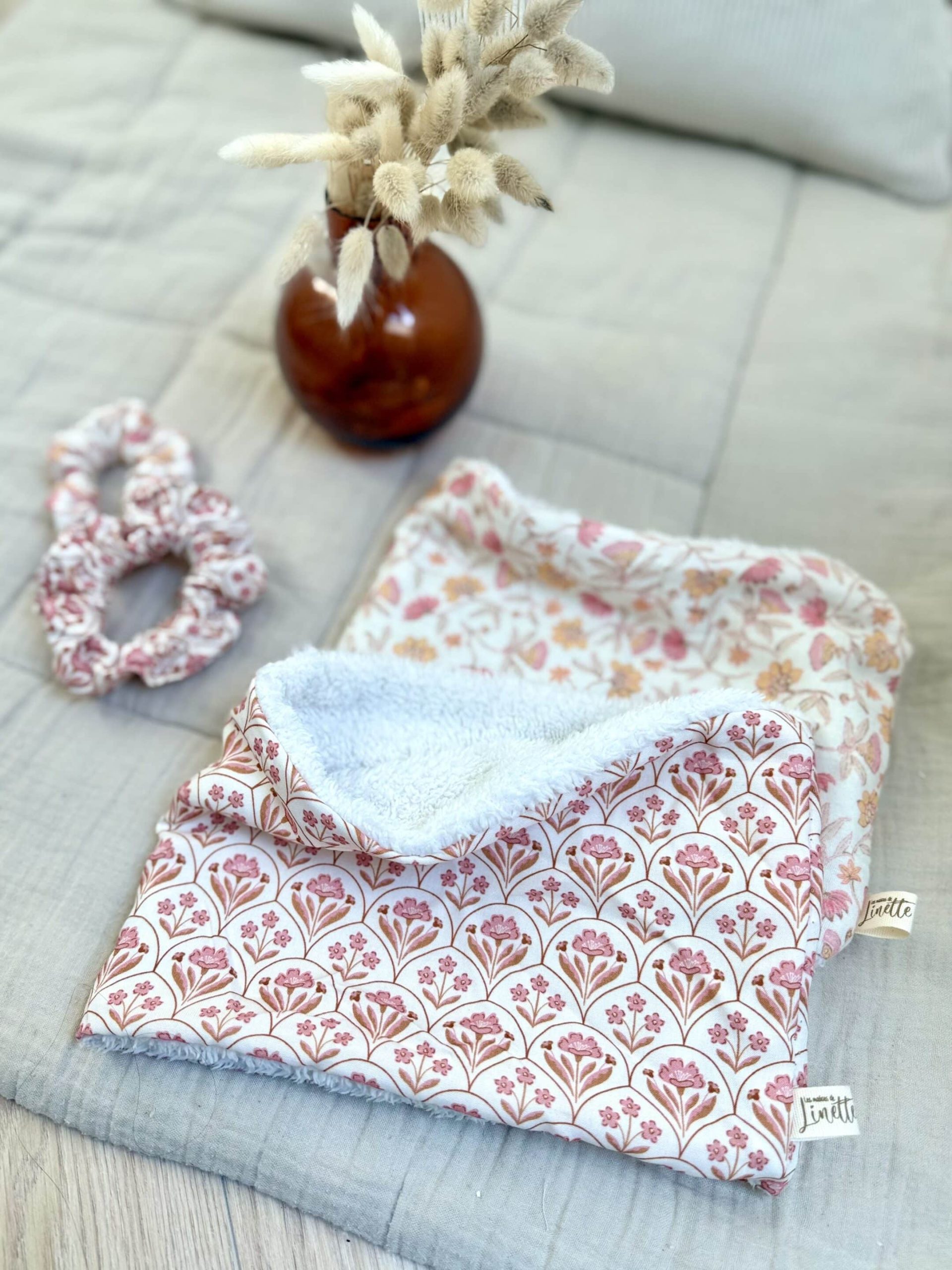 Tour de cou / snood avec un coté en popeline de coton et un côté en doudou ou moumoute.