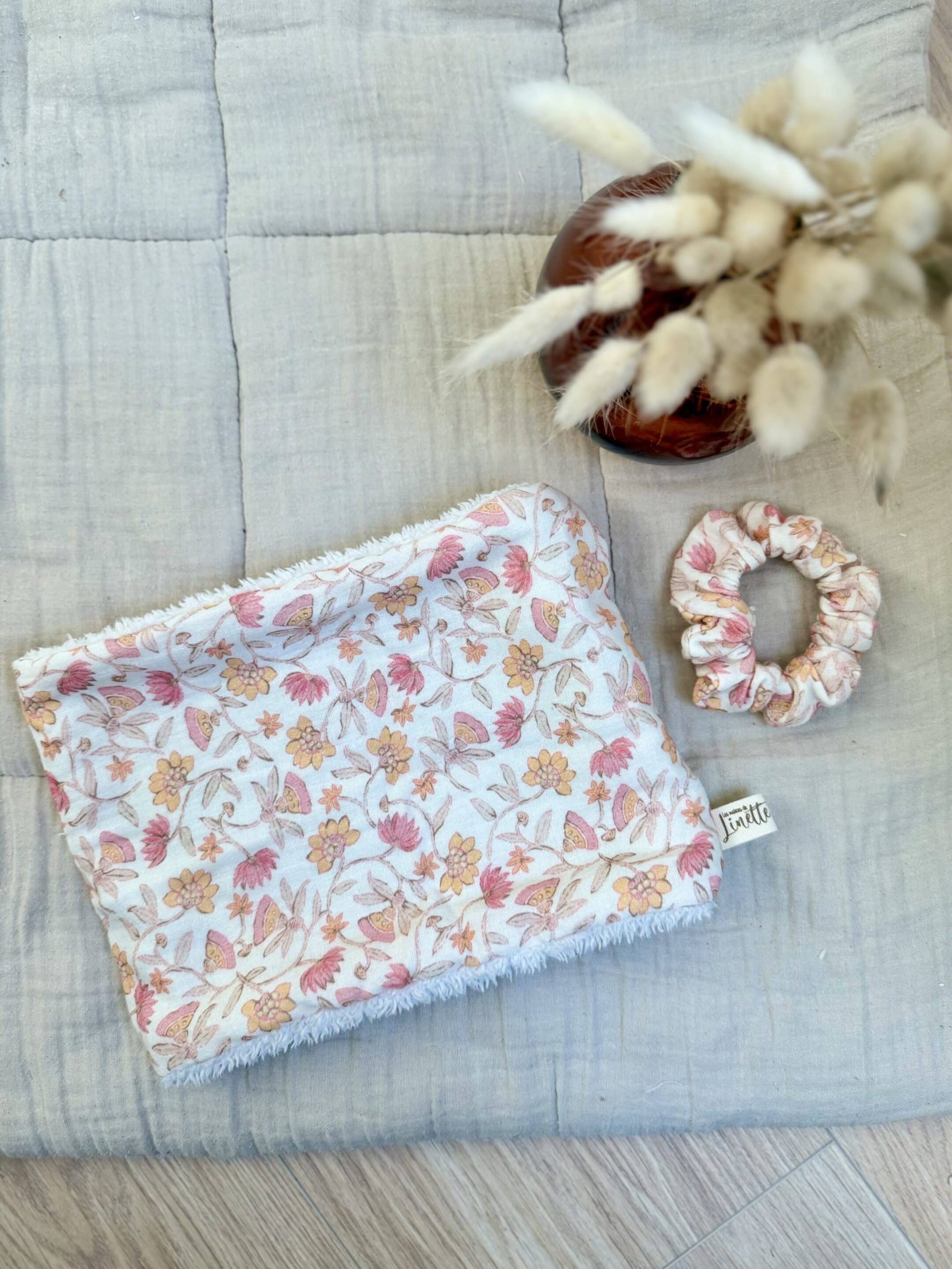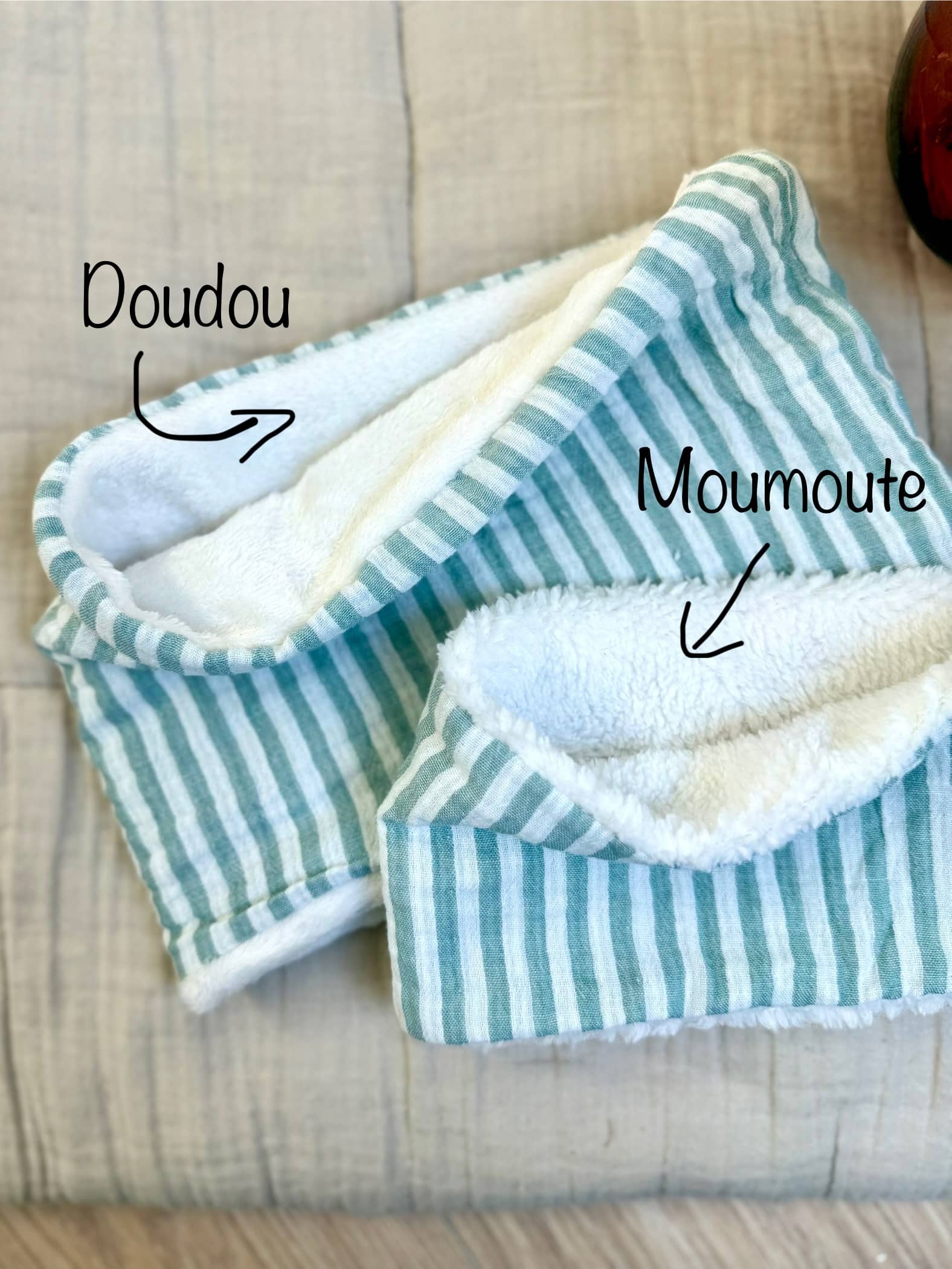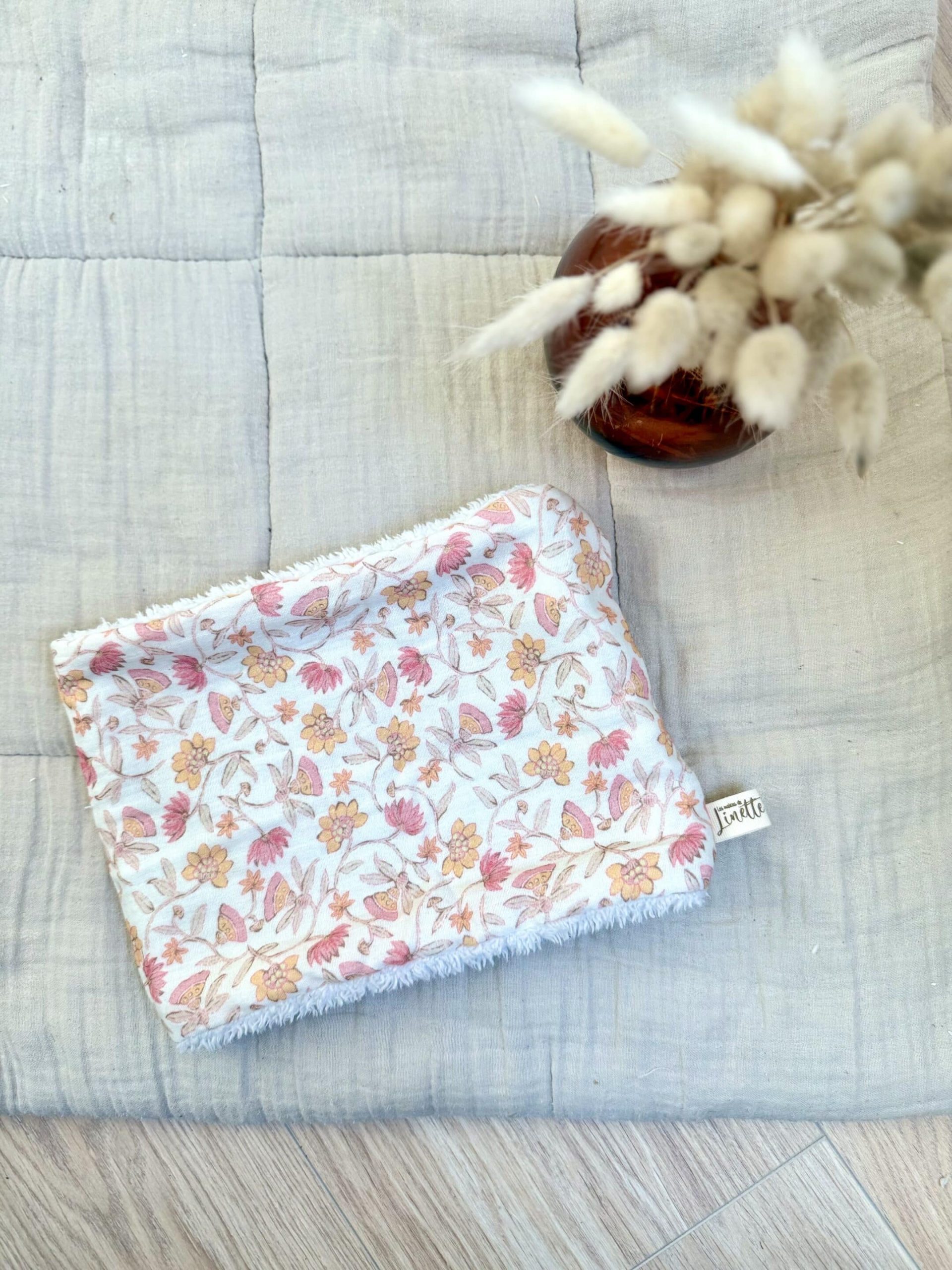 Tour de cou / snood avec un coté en double gaze et un côté en doudou ou moumoute.