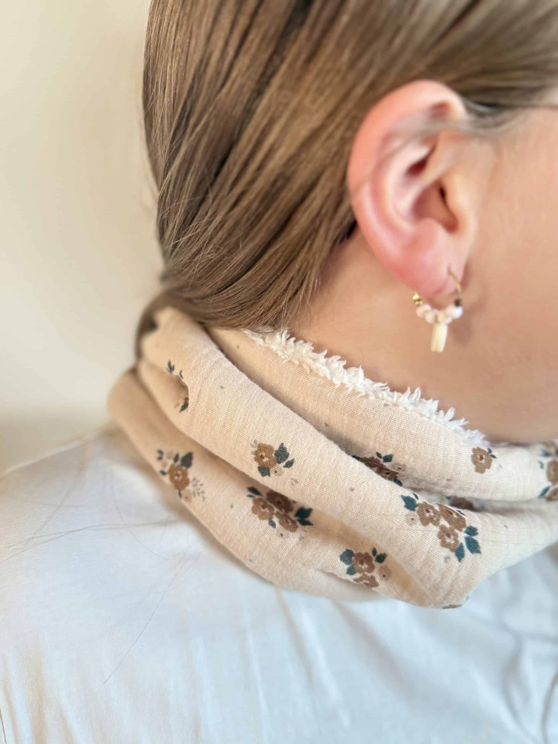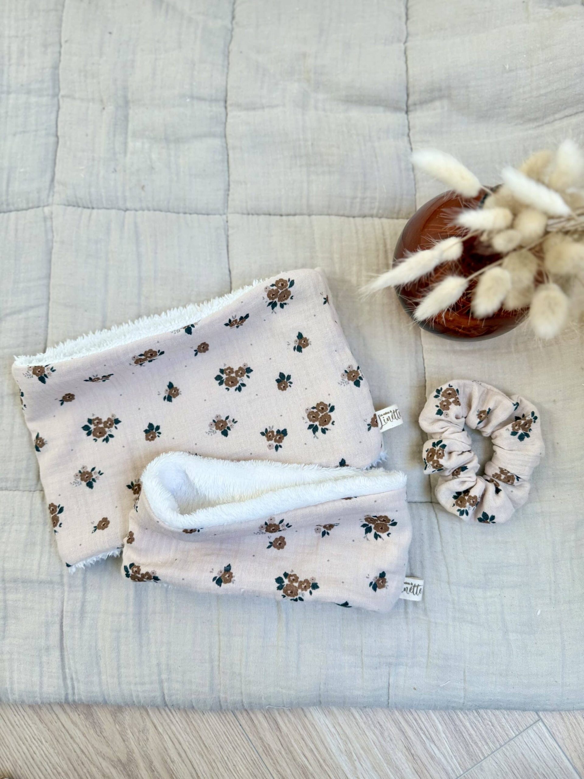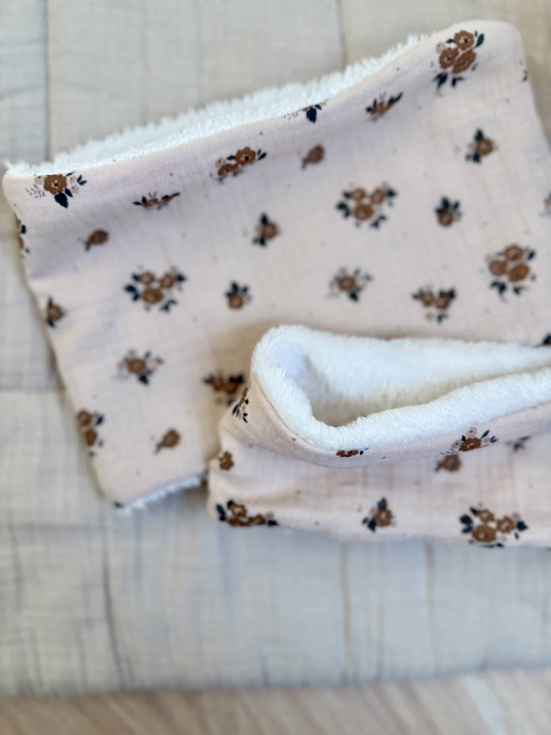 Tour de cou / snood avec un coté en double gaze et un côté en doudou ou moumoute.