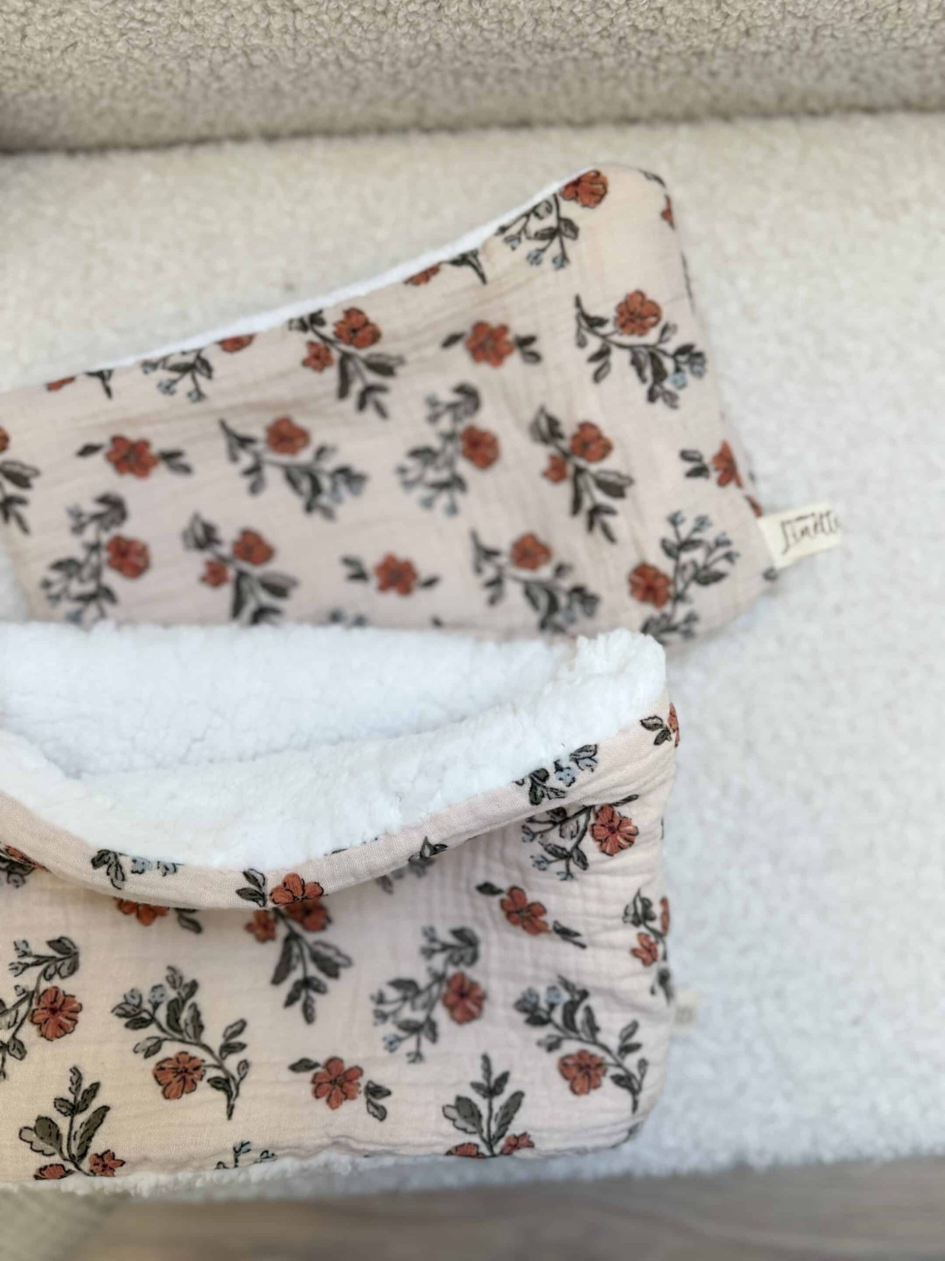 Tour de cou / snood avec un coté en popeline de coton et un côté en doudou ou moumoute.