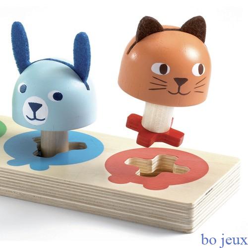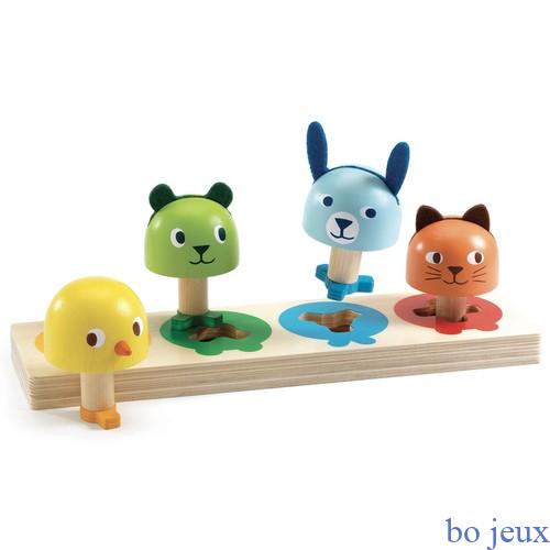4 animaux colorés à placer dans la base selon la forme de leur pieds. L’enfant observe la forme du pied pour le placer au bon endroit et tourne la tête pour voir le visage face à lui. Les têtes des animaux rondes sont faciles à attraper pour les petites mains. Les animaux tenant debout, l’enfant pourra jouer et se raconter des histoires. Age : +18m Largeur produit : 27 cm Hauteur produit : 9 cm Profondeur produit : 7,5 cm