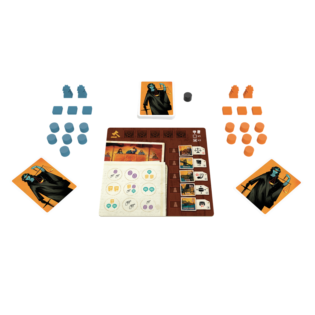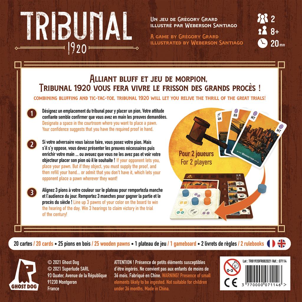 Août 1920. Deux célèbres avocats new-yorkais se livrent un combat acharné lors d’un retentissant procès. Soutenez votre plaidoirie avec de solides preuves et bluffez quand il le faut pour remporter la victoire dans le plus grand tribunal du monde ! Lors d’une partie de Tribunal 1920, les joueurs doivent placer 3 pions Plaidoirie à leur couleur sur une ligne de la Grille du tribunal pour remporter 1 Audience sur les 3 nécessaires pour gagner. Théoriquement, pour pouvoir poser un pion Plaidoirie sur un Emplacement, le joueur doit avoir dans sa main la combinaison de cartes Preuve demandée par cet Emplacement, mais…