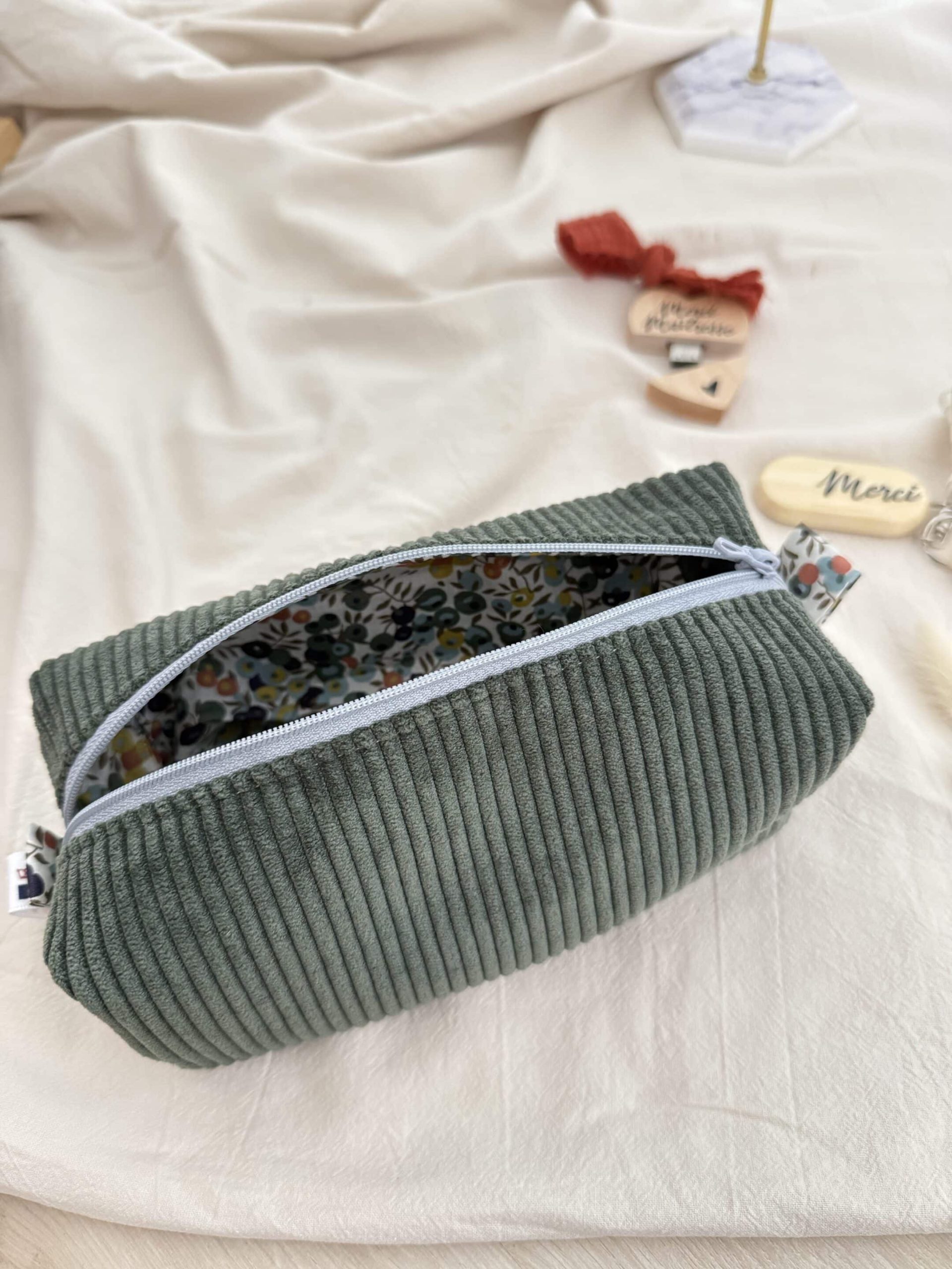 Trousse à crayon simple, velours côtelé kaki et intérieur liberty olivier