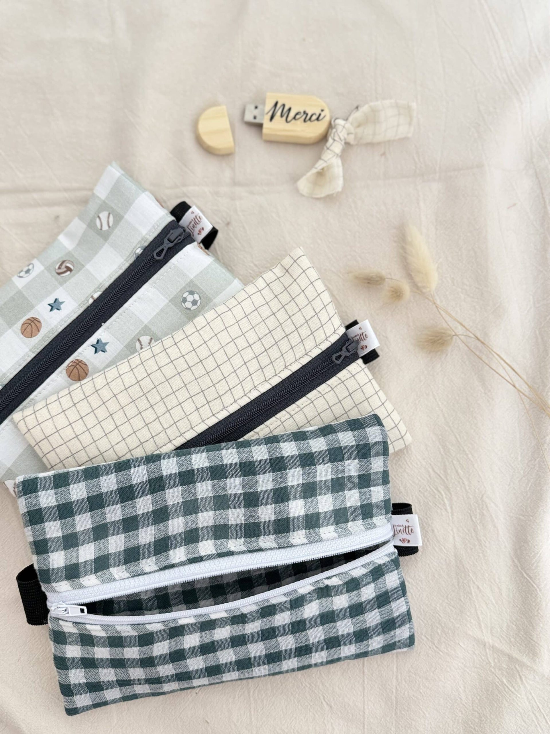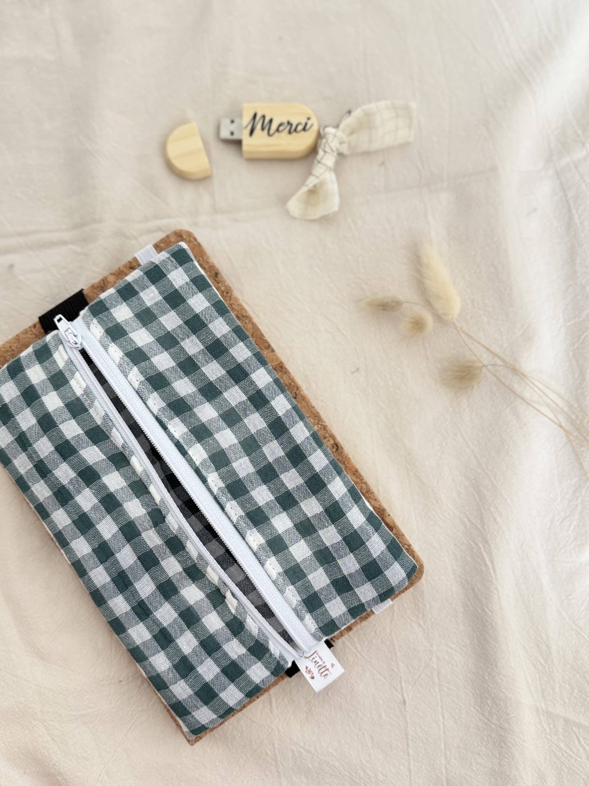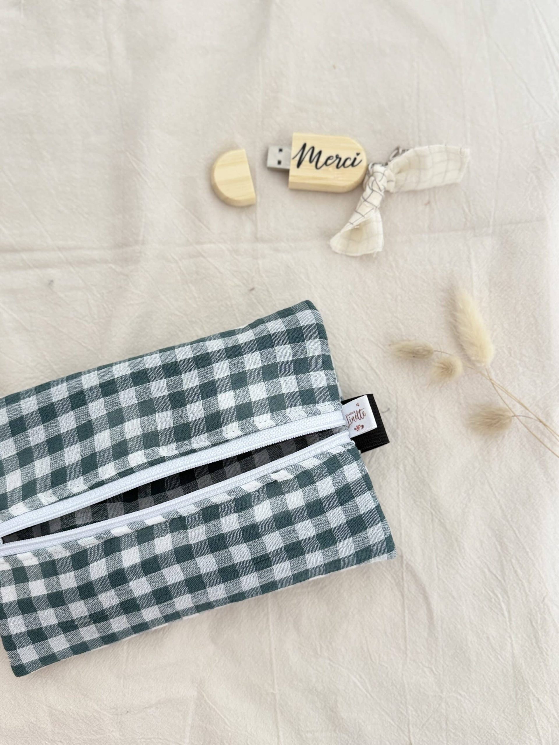 Trousse plate élastiquée, double gaze vichy vert